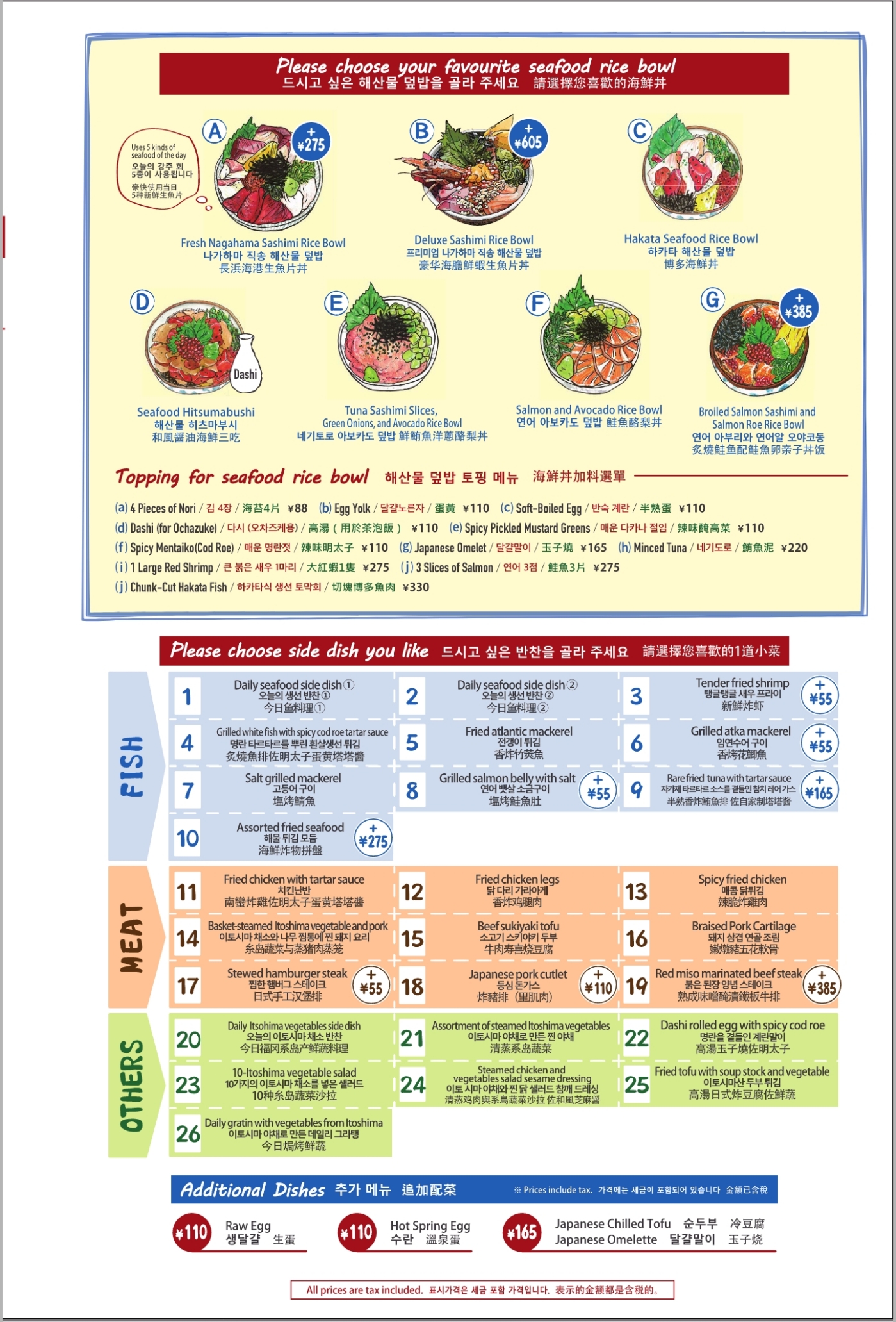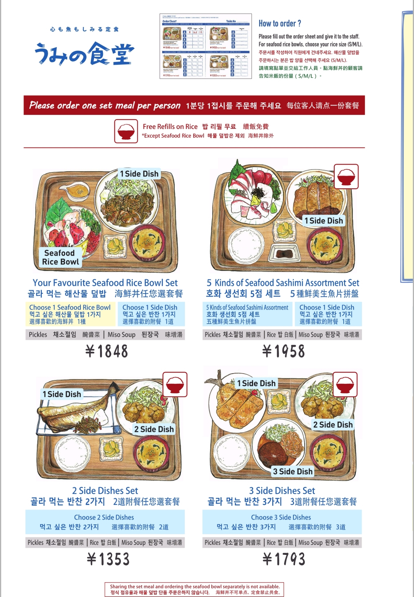 3품 정식 반찬 3개 + 밥 + 국 ¥2,000 내외